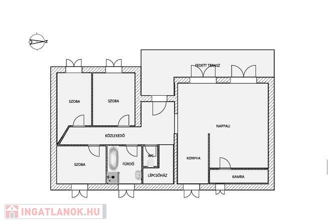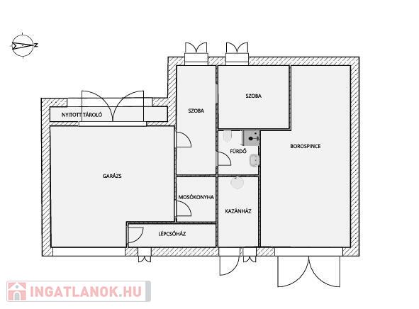 Elrendezése a következő: hatalmas, hangulatos galériás nappali tetőterasszal, 3 szoba, konyha+kamra, fürdőszoba. Az alagsorban kialakított szintén egy szoba, fürdőszoba, külső bejárással a garázs felől, ahol nyári konyha vagy egy külön lakrész létrehozható.