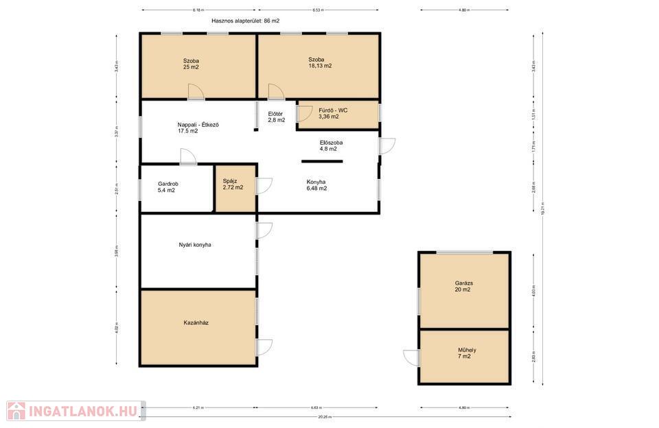 A lakóház folytatásában található a nyári konyha, kazánház, garázs és műhely.