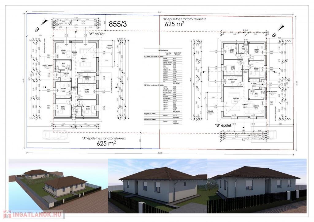 A 1250 nm-es közművesített (víz, villany, csatorna, gáz) telken 2 darab nettó 102 nm-es, egyszintes, NÉGY HÁLÓSZOBÁS + amerikai konyhás nappalival rendelkező családi ház épül, 625 NM SAJÁT TELEKHÁNYADDAL. A tágas lakótérben 4 hálószoba, nappali, konyha, fürdőszoba és vendég toalett kerül kialakításra, és egy 15 nm-es TERASZ is tartozik hozzá.