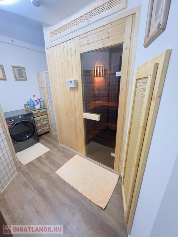 A szuterén külön kis birodalom: itt kapott helyet egy vendégszoba, egy vadonatúj fürdőszoba, egy kényelmes szauna, valamint a gépészet.
