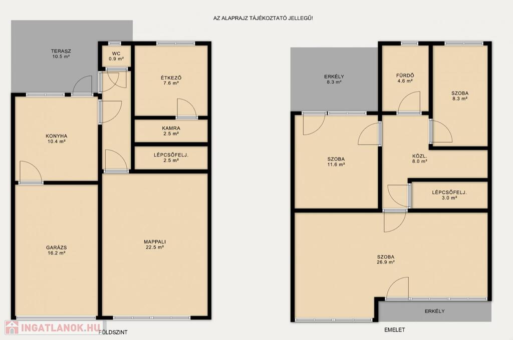 • Földszint: Garázs, tágas étkező, konyha, kamra, kényelmes nappali és egy külön mellékhelyiség.