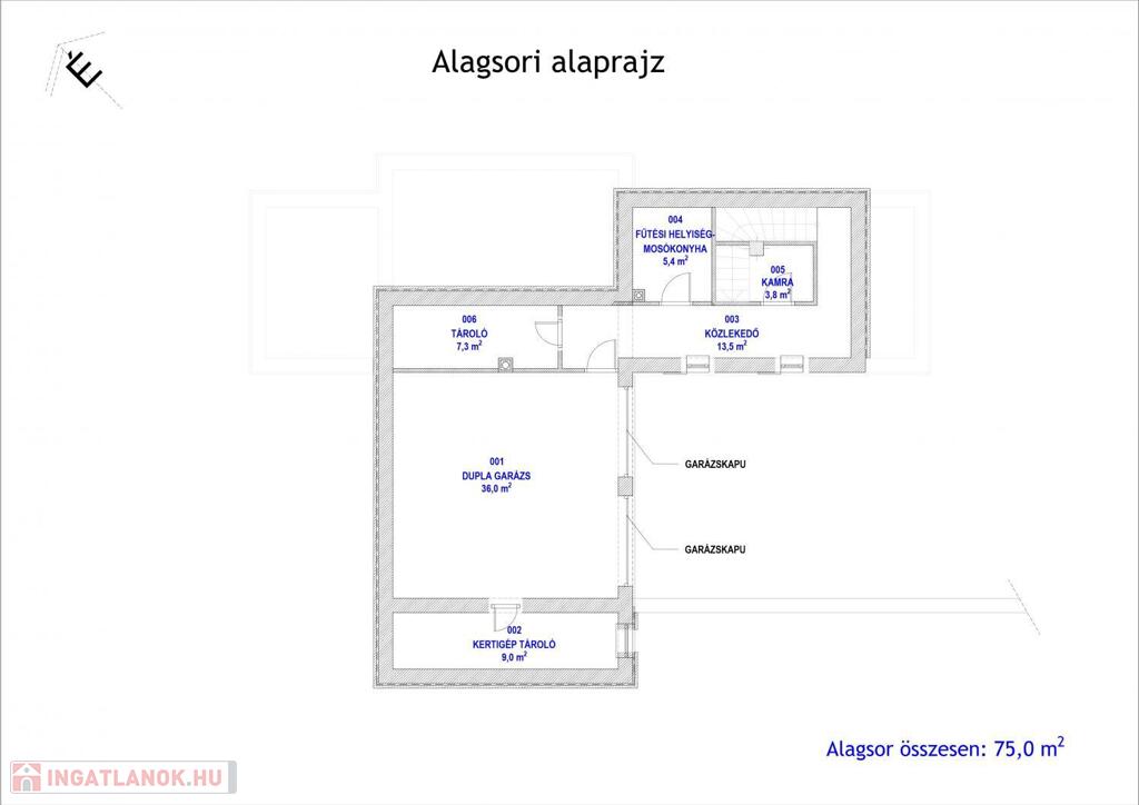 Alagsor: duplagarázs, tárolók, kamra, mosókonyha, kazánhelyiség.