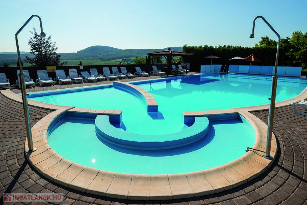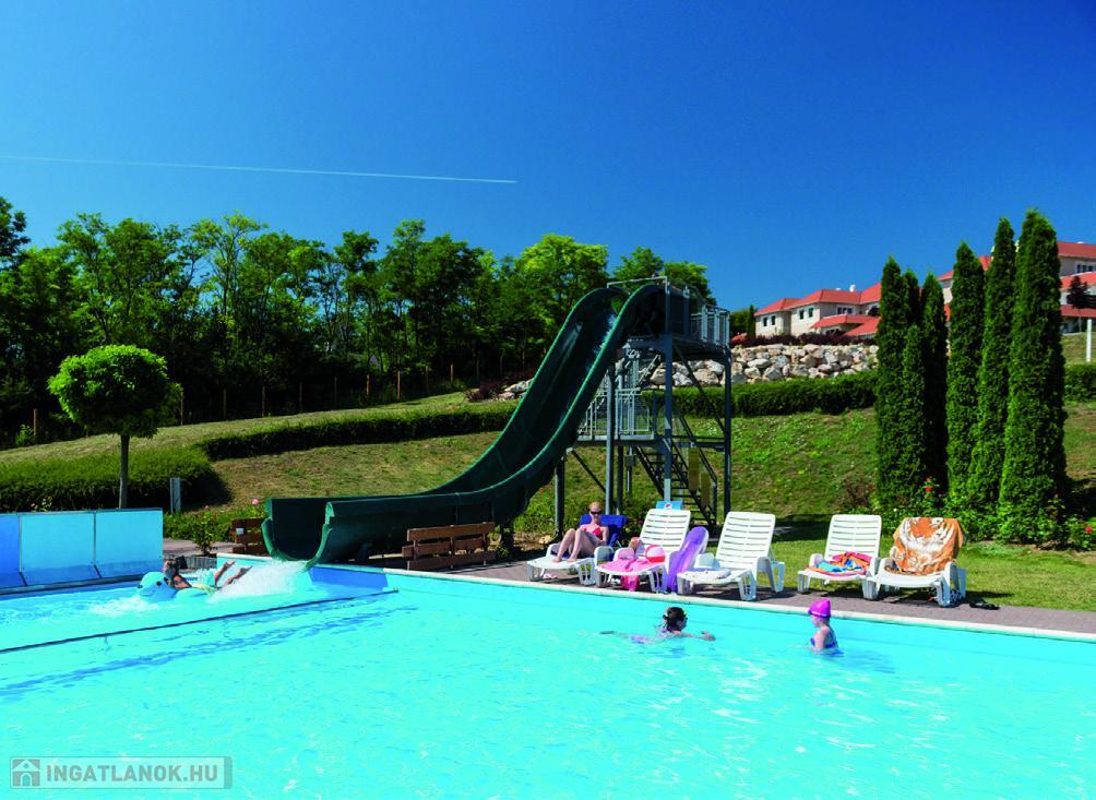 -csúszdával felszerelt kültéri medence, panorámás napozó terasszal, játszótérrel,
