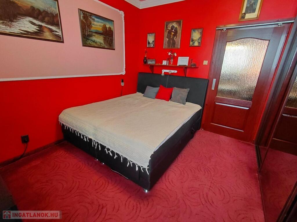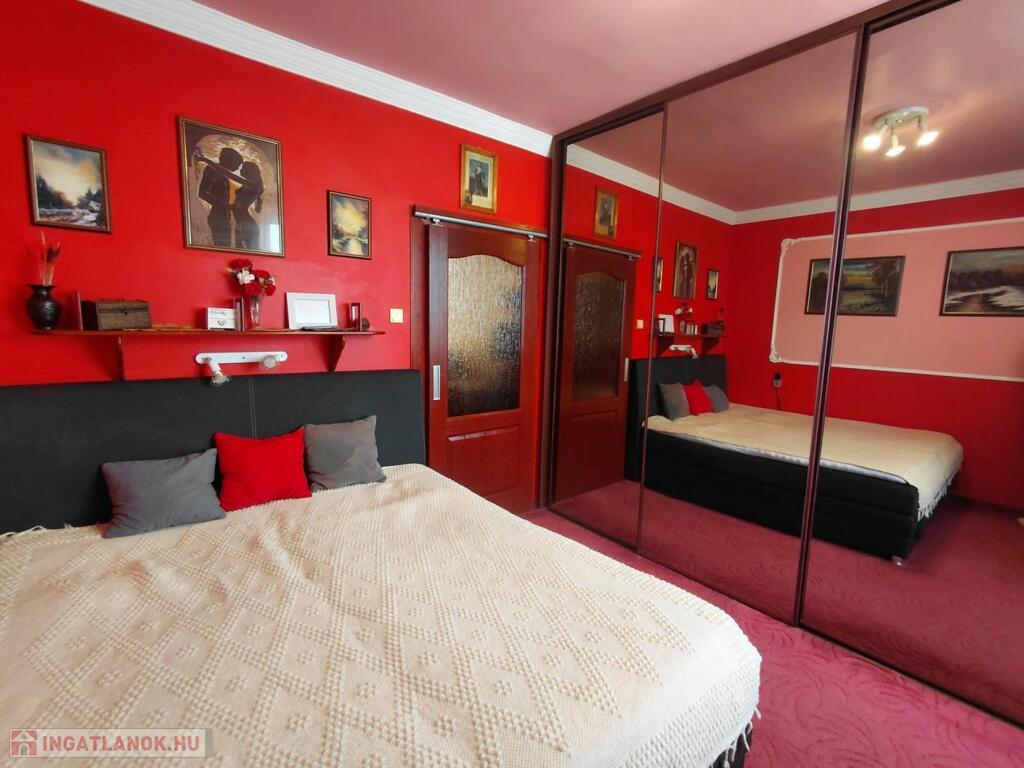 - Hálószoba: padlószőnyeg, nagyméretű tükrös gardrób, motoros boxspring franciaágy