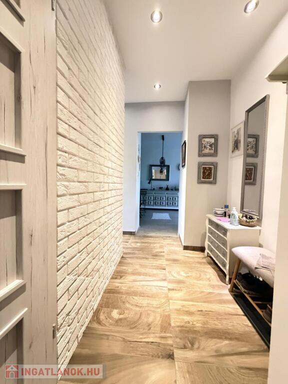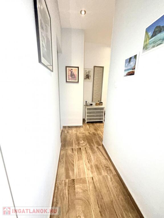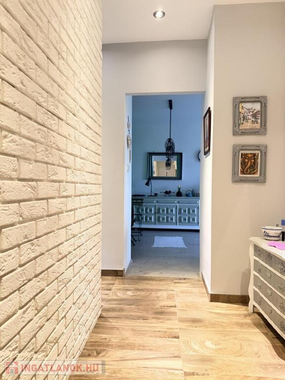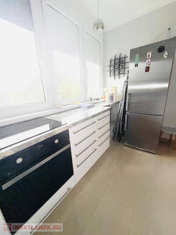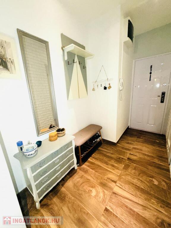 A konyhabútor egyedi stílusban,gépészettel felszerelt . A nappali , előszoba és igényes fürdőszobában színben és stílusban passzoló burkolatokkal .A hálószobában egy praktikus,szó szerint mindent elnyelő beépített gardrób szekrénnyel.