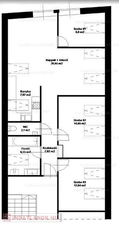 Tágas, világos terek: 3 különnyíló szoba + amerikai konyhás nappali, nagy belmagasság, kiváló térkihasználás.