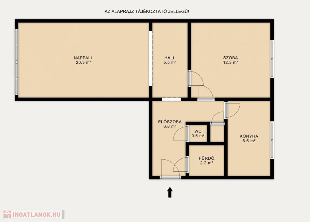 Az ingatlan elrendezése jól átgondolt: tágas nappali, külön nyíló hálószoba, külön konyha, fürdőszoba, WC és előszoba alkotják.