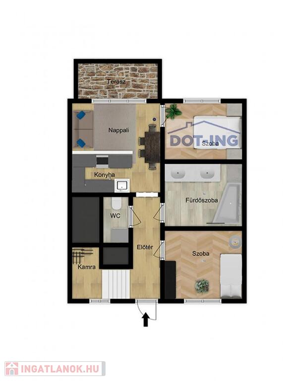 Tatabánya Kertváros csendes utcájában, 4 lakásos társasház földszintjén eladó egy 44 nm-es felújított, 2,5 szobás lakás, melyhez terasz és saját közvetlen kertkapcsolat is tartozik.