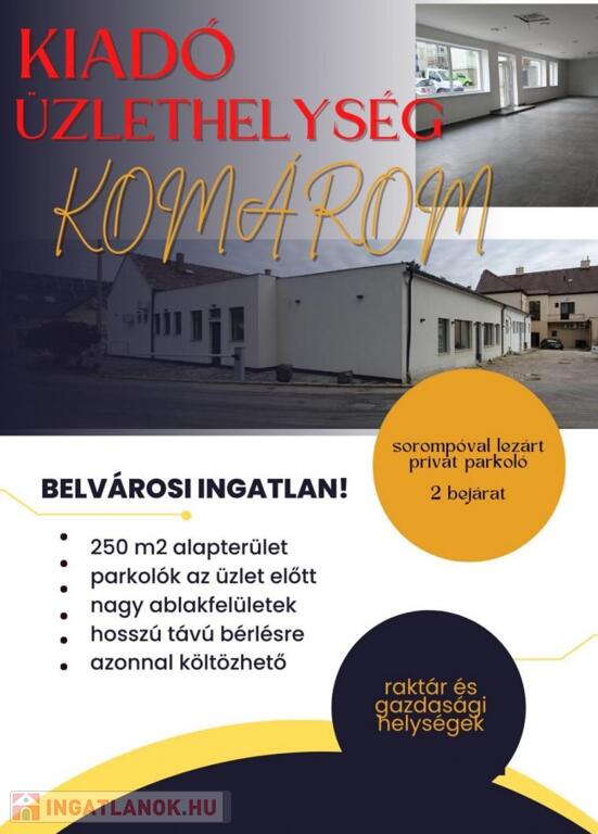 Kiadásra kínálunk Komárom frekventált részén (közelben Duna áruház, számos üzlet, iskola,egyég intézmények) egy 250nm-es teljes körűen FELÚJÍTOTT üzlethelyiséget (üzlet+ raktártér)