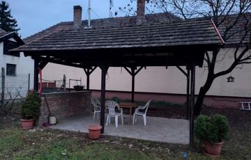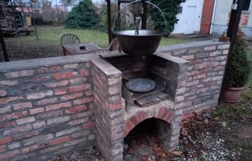 A kertben fedett kiülő és sütegő nyújt árnyékot nyáron.