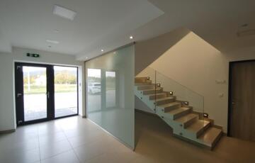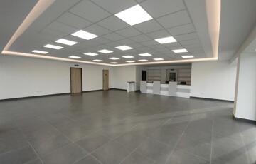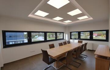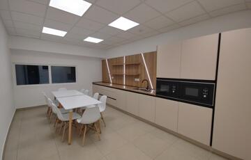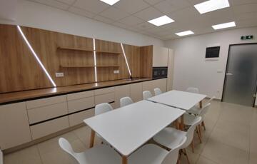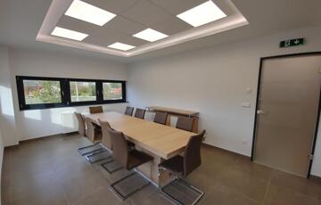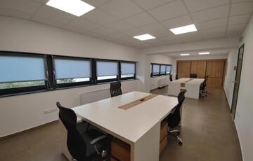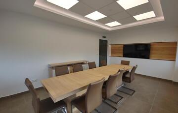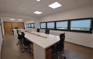 • Upper Floor (The Control Room): 224 m² of pure elegance. Panoramic view of the Gerecse mountains, director’s office, meeting room, automatic LED lighting, and a kitchen-dining area big enough for team building.