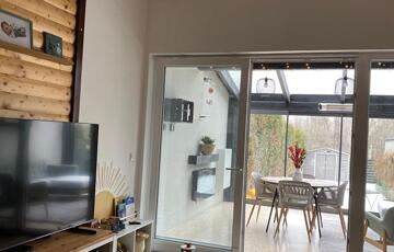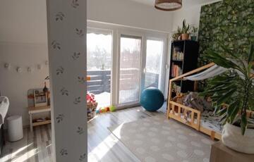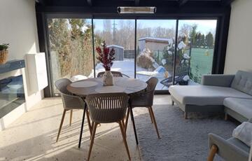 A lakás egyik kiemelkedő előnye a 16 m²-es, teljesen zárt terasz, amely nagy üvegfelületeinek köszönhetően világos, egész évben használható élettér. Padlófűtéssel, kandallóval és elektromos fűtési lehetőséggel is ellátott, ugyanakkor a nappalitól teljesen leválasztható – ideális pihenéshez, dolgozószobának vagy télikertnek.