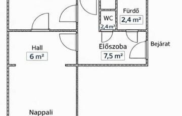Elosztása praktikus és élhető: tágas nappali + hall (~24 m²) hálószoba (~12,5 m²) konyha (~ 6,3 m²) fürdő (~ 2,5 m²) WC (~ 1 m²) előszoba (~ 7,5 m²) Összesen: ~ 53 m²